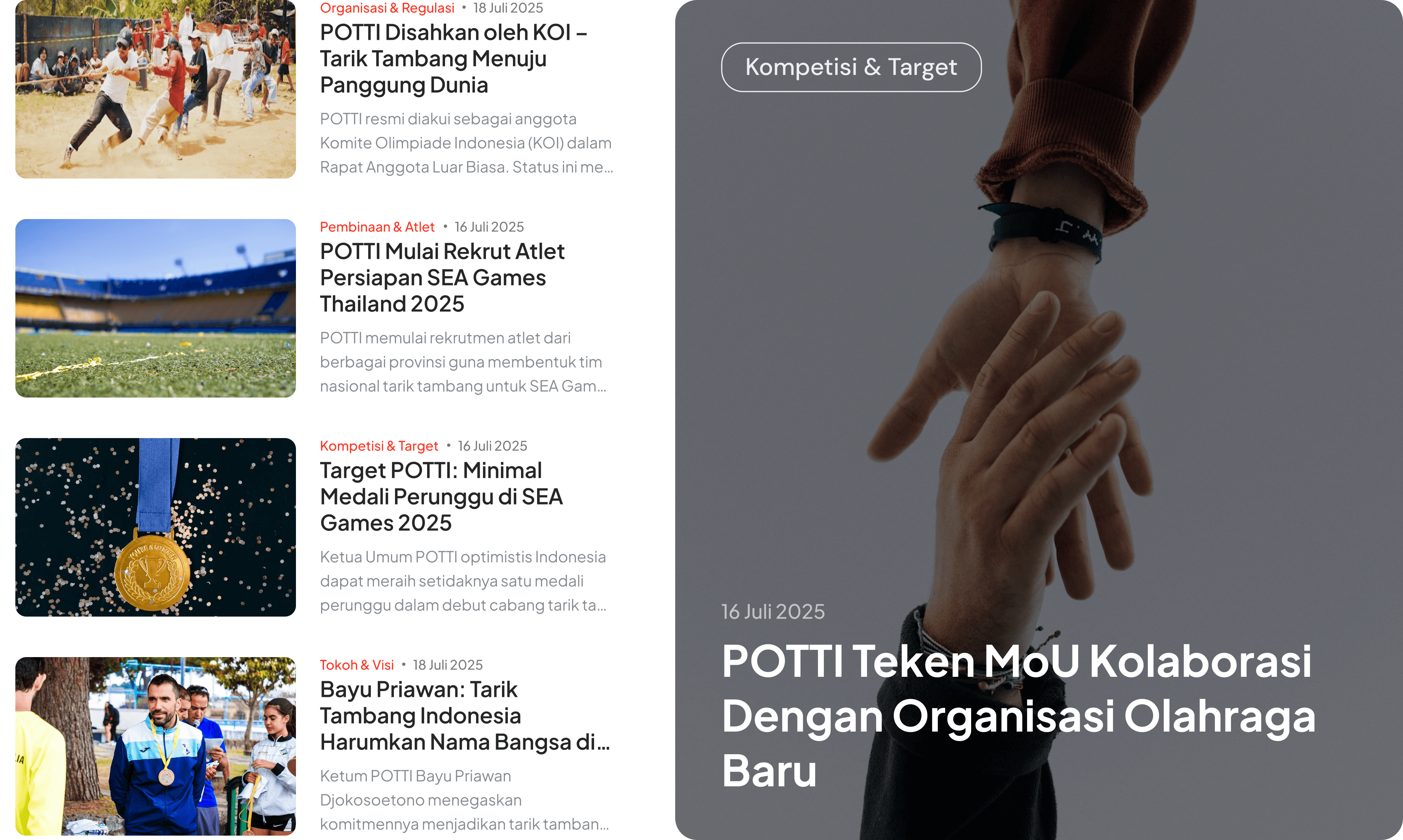 Kami di POTTI memahami pentingnya eksistensi digital dalam memajukan olahraga tarik tambang. Dengan strategi konten, media sosial, dan promosi digital yang terintegrasi, kami terus memperluas jangkauan dan menginspirasi lebih banyak masyarakat untuk mengenal dan mencintai tarik tambang.